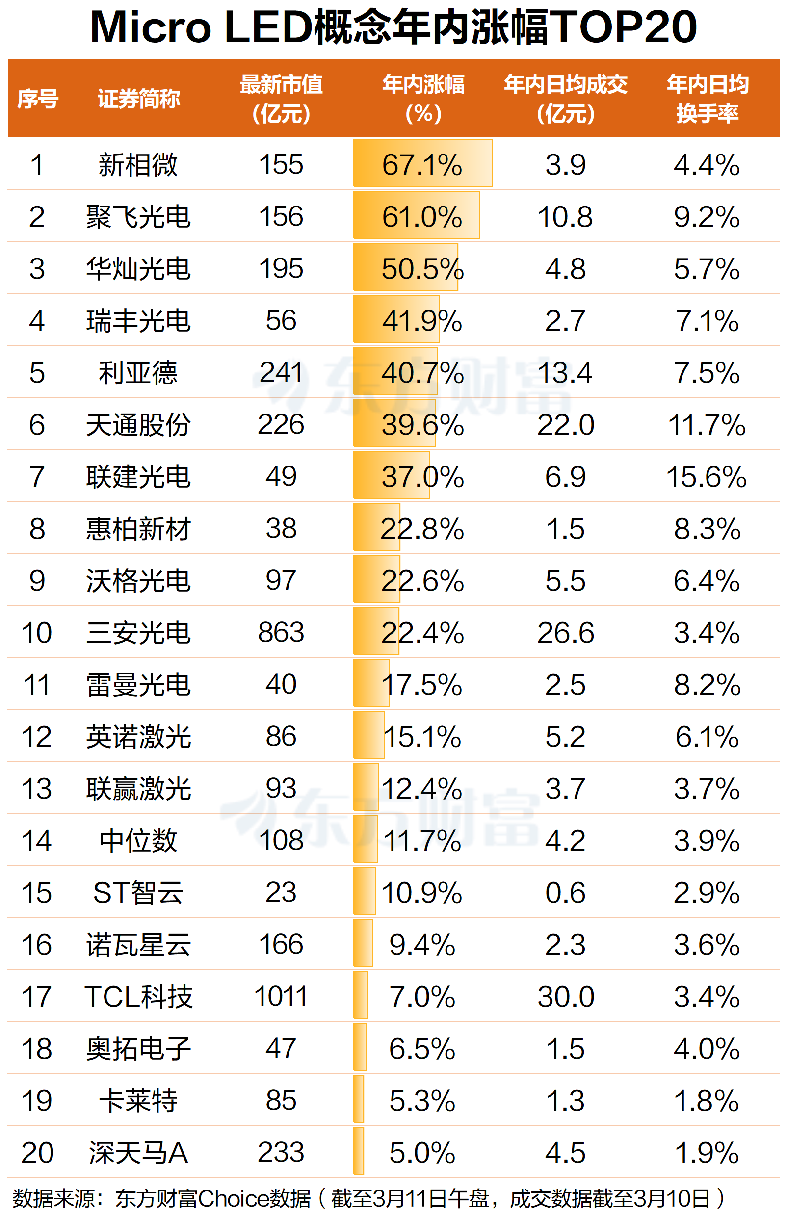 在市场高度关注下,A股Micro LED概念股今年股价整体表现亮眼。东方财富股票Choice数据显示,截至3月11日午盘,今年Micro LED概念26只成分股中有21只股价上涨,涨幅中位数高达17.5%,其中,新相微涨幅最大,年内涨超66%;聚飞光电紧随其后,年内涨超60%。此外,华灿光电、瑞丰光电、利亚德等年内均涨超40%。