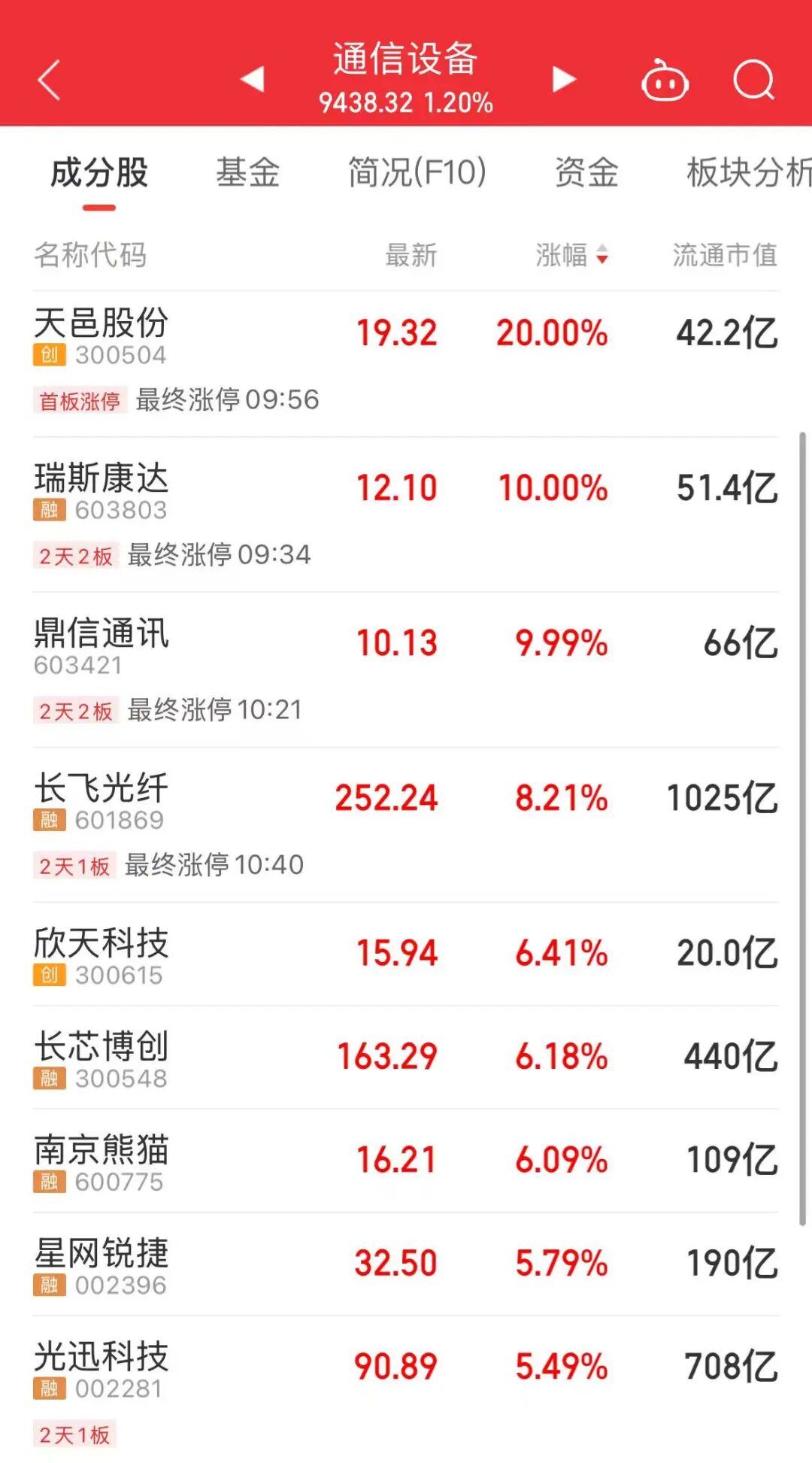 3月10日,“6G网要来了”话题冲上微博热搜榜。今天上午,通信设备板块上涨,天邑股份、瑞斯康达等个股大涨。