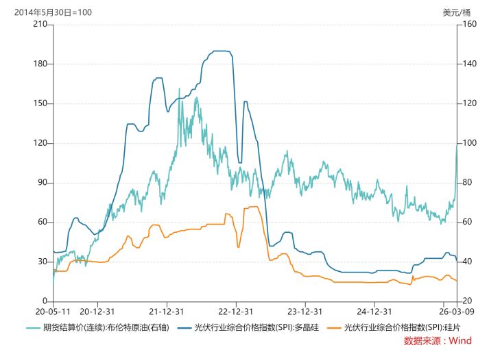记者梳理近6年布伦特原油期货结算价、光伏行业综合价值指数(SPI)多晶硅及硅片价格走势发现,原油价格与光伏产业链核心原料价格变动,存在极强的关联性。