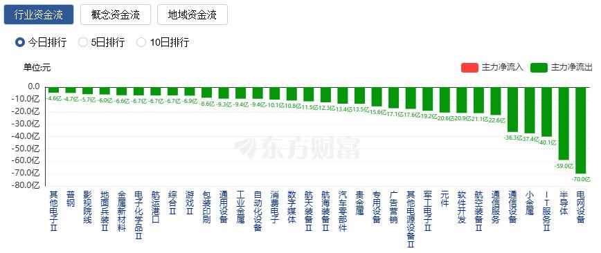 净流出方面,电网设备、半导体、IT服务等净流出排名靠前,其中电网设备净流出70.05亿元。