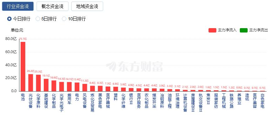 行业资金方面,截至收盘,电池、光伏设备、化学原料等净流入排名靠前,其中电池净流入75.69亿。