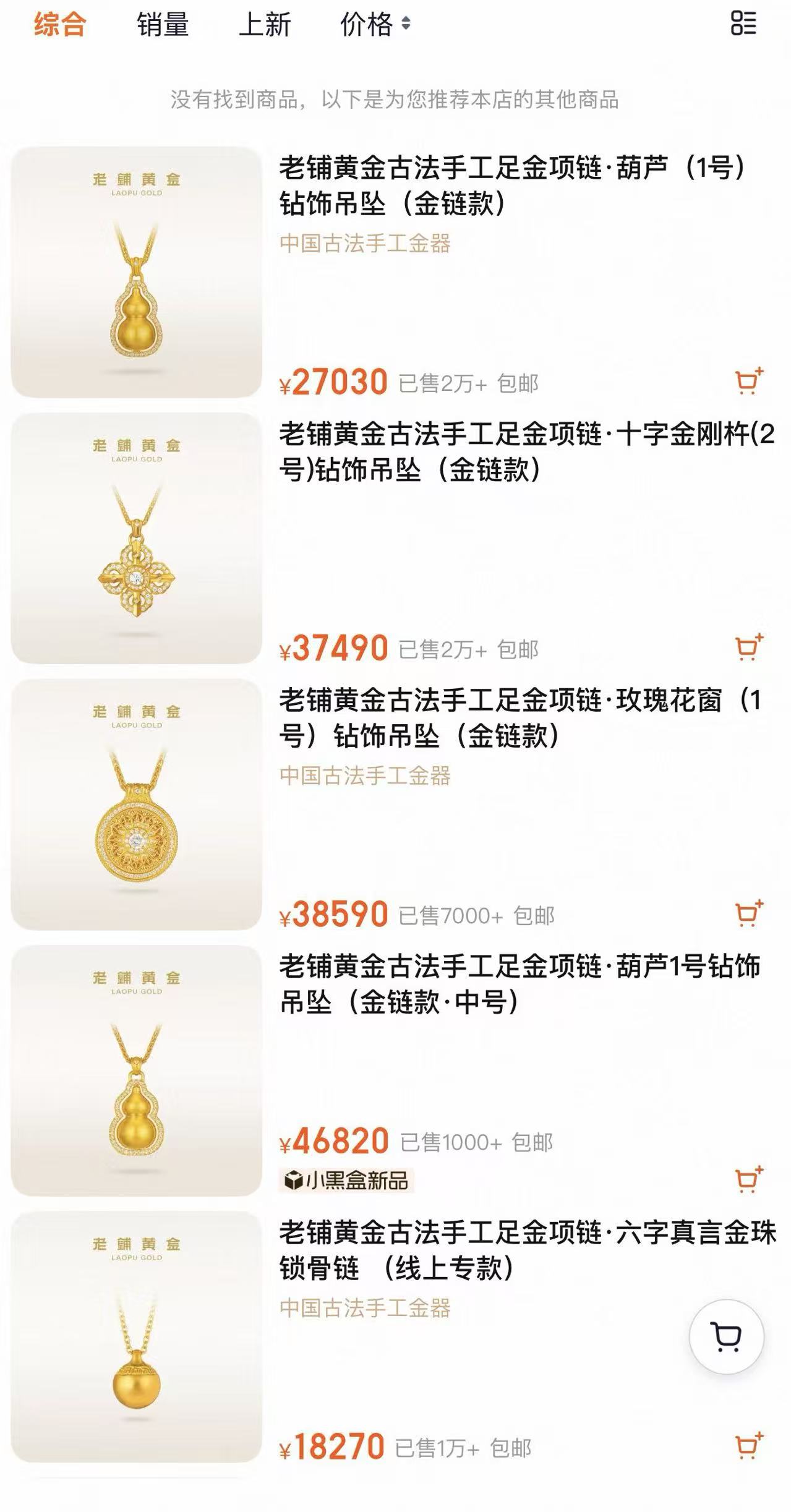 3月11日,界面新闻在老铺黄金天猫旗舰店发现,一款售价27030元起的黄金古法手工足金项链已售2万多件,另外一款售价37490元起的十字金刚杵足金项链也已售2万多件。此外,上述收藏级单品已经无法在店铺搜索到。