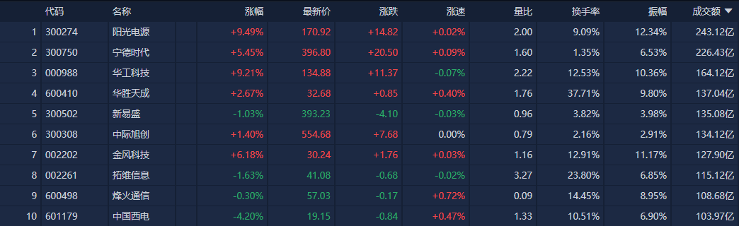 个股方面,阳光电源全天成交额超243亿元,位居沪深两市第一;宁德时代、华工科技、华胜天成等个股成交额居前。