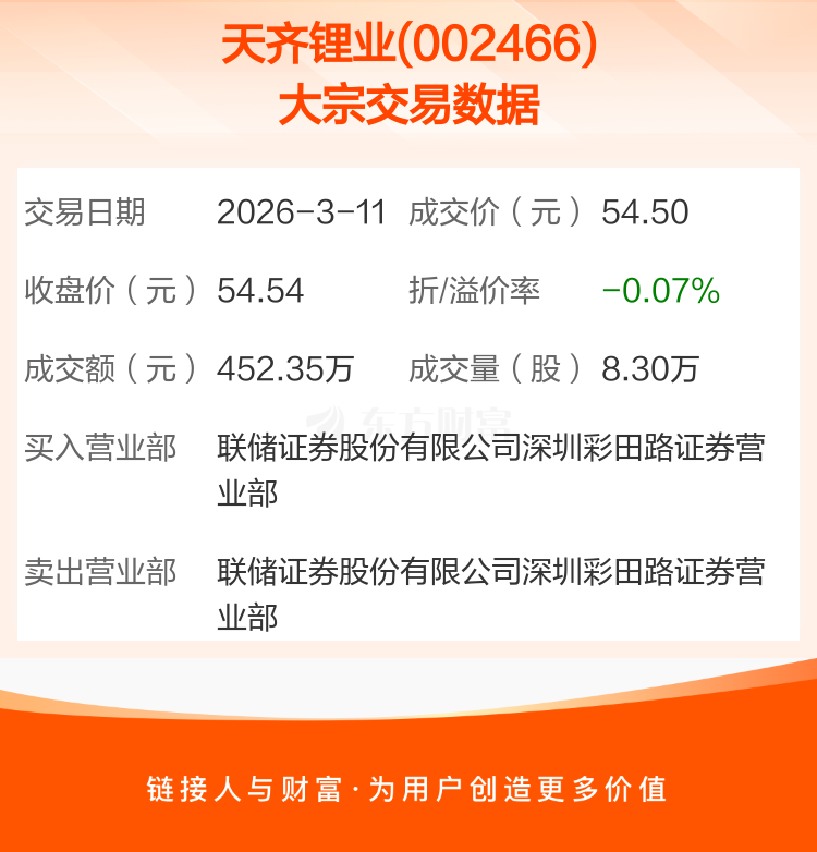 大宗交易:天齐锂业成交452.35万元,折价0.07%(3-11)