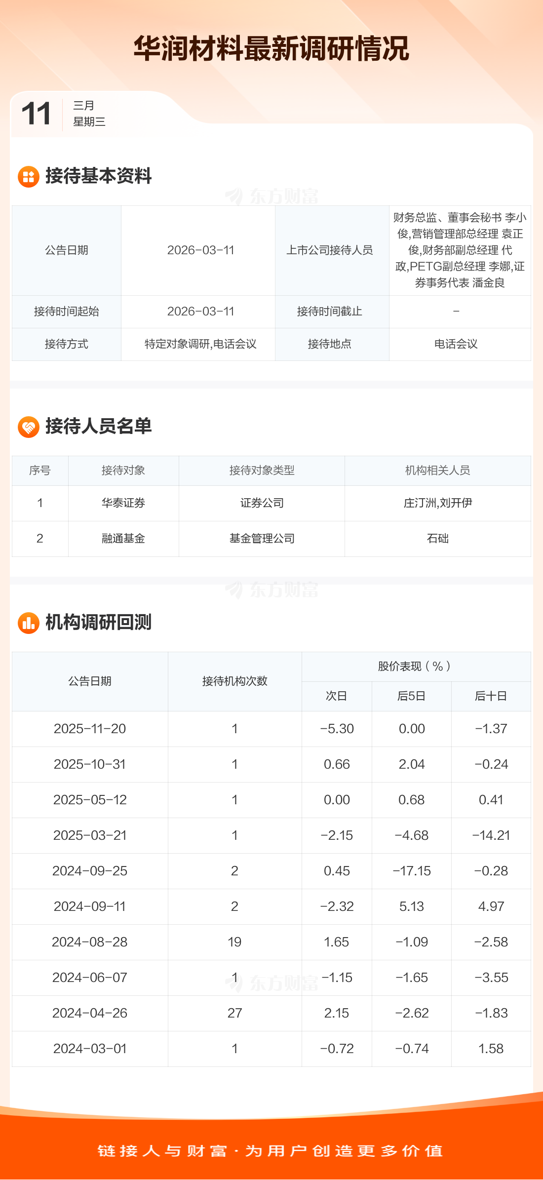 华润材料3月11日公告称,3月11日接待华泰证券等2家机构调研。接待人员包括财务总监、董事会秘书 李小俊,营销管理部总经理 袁正俊,财务部副总经理 代政,PETG副总经理 李娜,证券事务代表 潘金良。