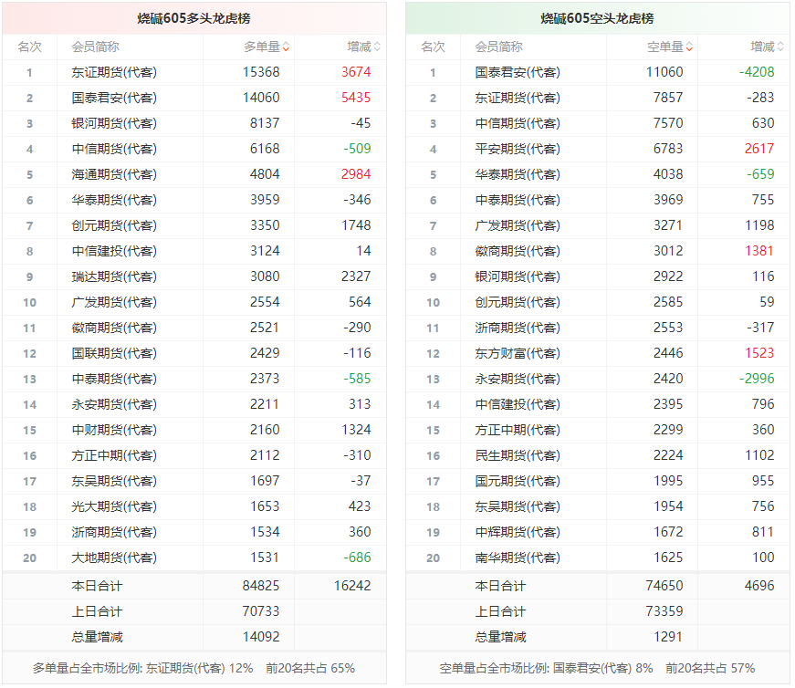 总体而言,烧碱605合约今日增仓上行,多空持仓排名前20席中,多空双方均呈进场态势,多头进场意愿强于空头。