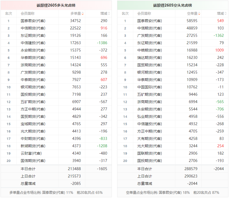总体而言,碳酸锂2605合约今日减仓下行,多空持仓排名前20席中,多空双方均呈退场态势,多头退场意愿强于空头。
