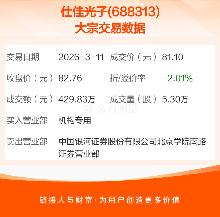 2026年3月11日,仕佳光子发生1笔大宗交易,共成交5.30万股,成交金额429.83万元,占其流通市值比例为0.01%。