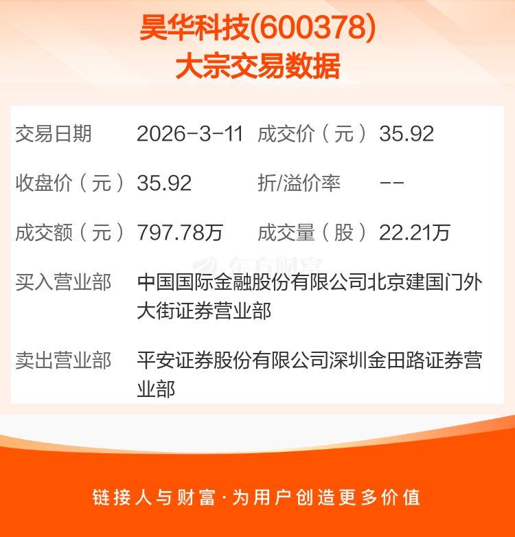 2026年3月11日,昊华科技发生1笔大宗交易,共成交22.21万股,成交金额797.78万元,占其流通市值比例为0.02%。