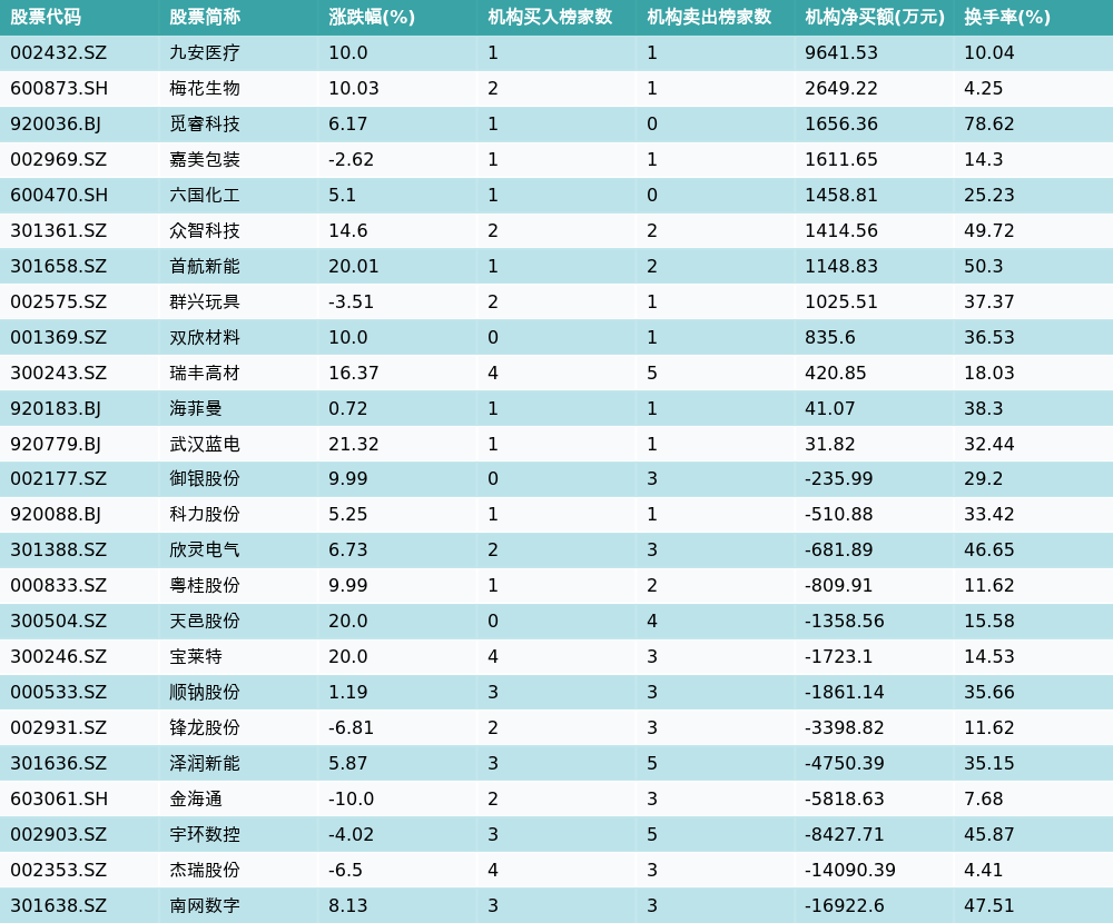 南财智讯3月11日电,盘后数据显示,因当日异动登上龙虎榜的个股中,25只沪深A股龙虎榜出现了机构的身影,机构合计净卖出38654.2万元,具体来看,机构净买入12只个股,净卖出13只个股。其中,机构净买入前三分别为九安医疗(002432.SZ)、梅花生物(600873.SH)与觅睿科技(920036.BJ),详情见下图:机构净卖出的个股中,前三分别为南网数字(301638.SZ)、杰瑞股份(002353.SZ)与宇环数控(002903.SZ)。