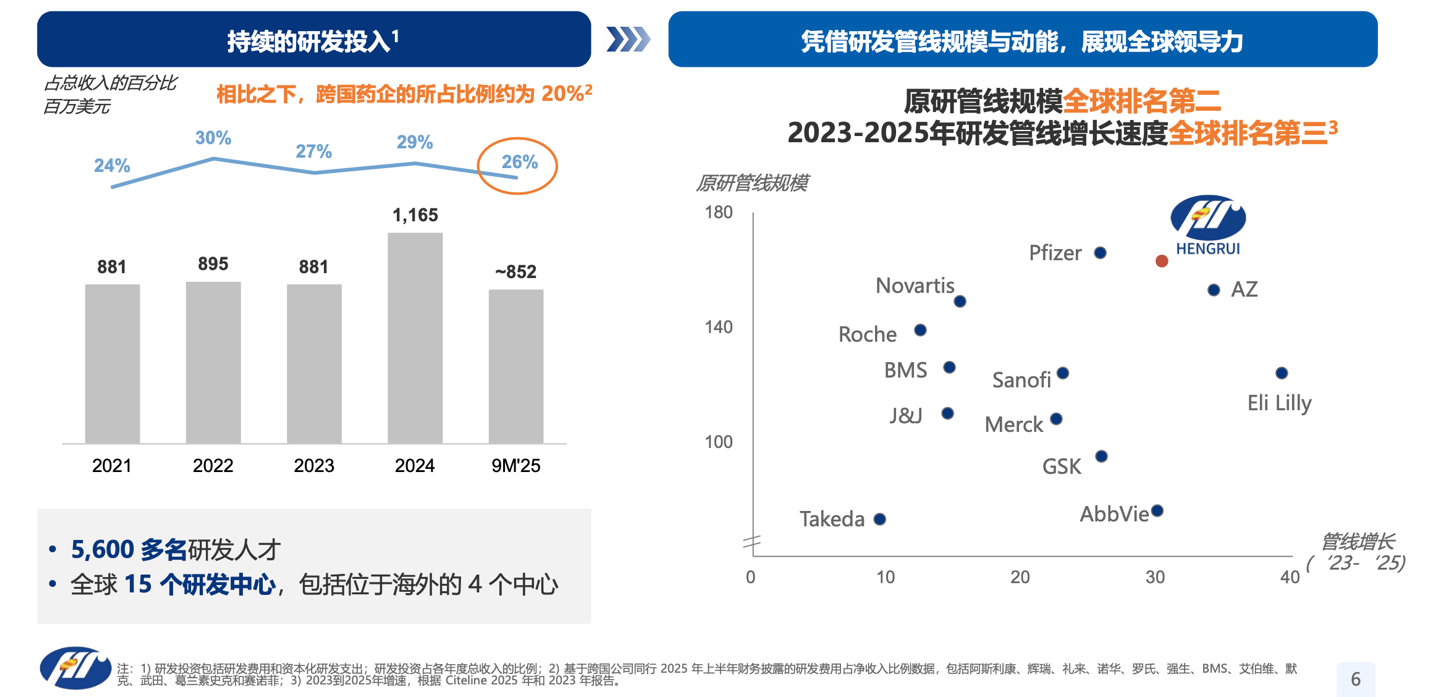 如今,创新药已撑起恒瑞医药营收的半壁江山。2025年前三季度,公司创新药收入占比达55%,同比增长23%。根据2025年Citeline发布的管线规模排名,恒瑞医药自研管线数量排名第二,仅次于辉瑞(PFE.US)。