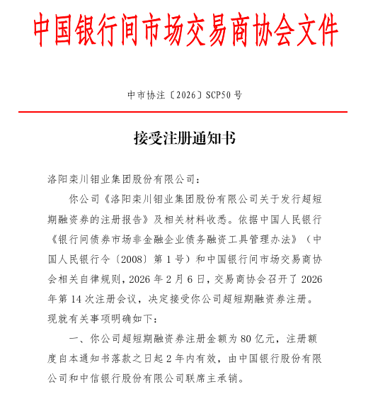 近日,中国银行间交易商协会公告,接受洛阳栾川钼业集团股份有限公司超短期融资券注册,金额为80亿元,注册额度自2月25日起2年内有效,由中国银行和中信银行联席主承销。