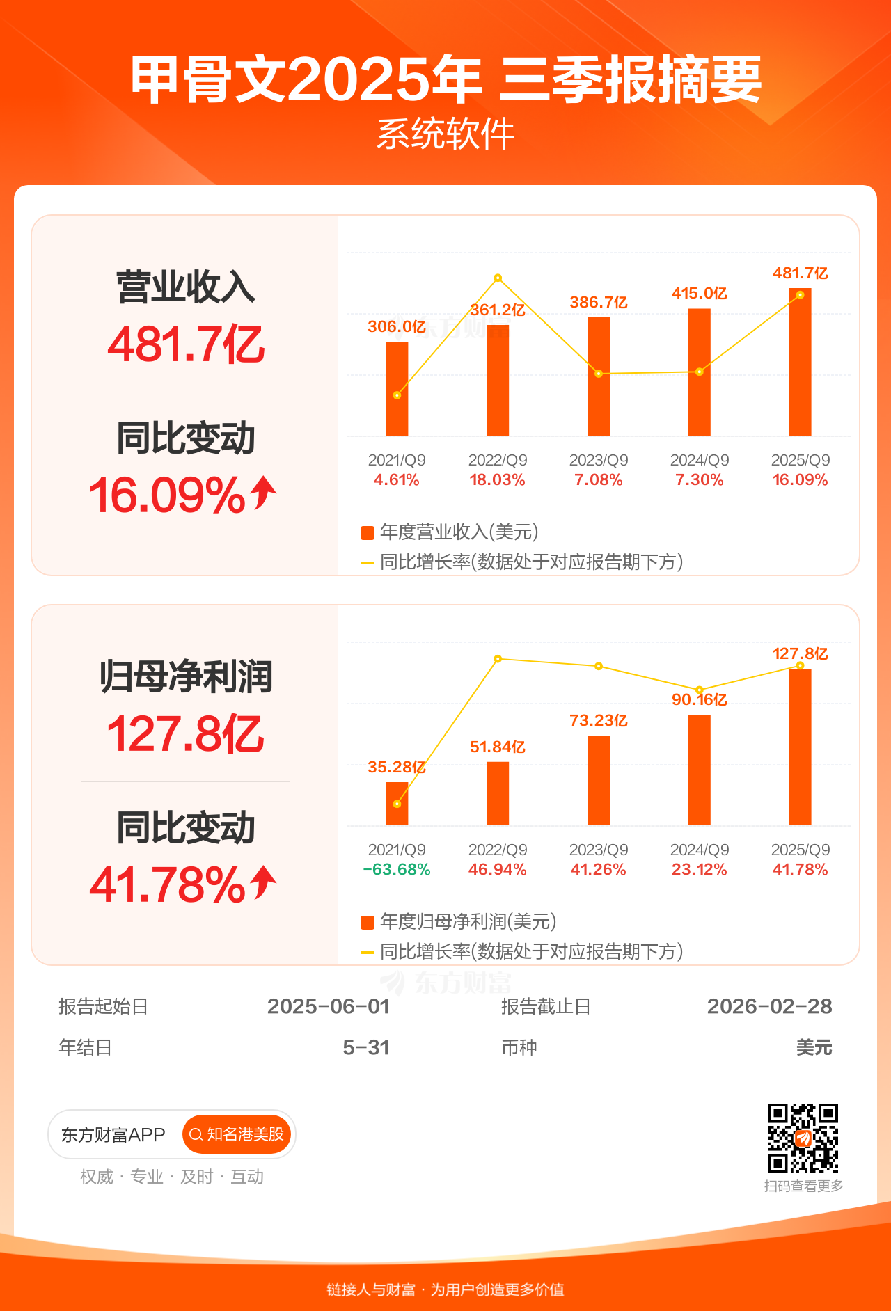 甲骨文3月10日发布三季报业绩,截至2026年2月28日的9个月内,该公司营业收入481.73亿美元,同比增长16.09%;公司权益持有人应占溢利(归母净利润)127.83亿美元,同比增长41.78%。