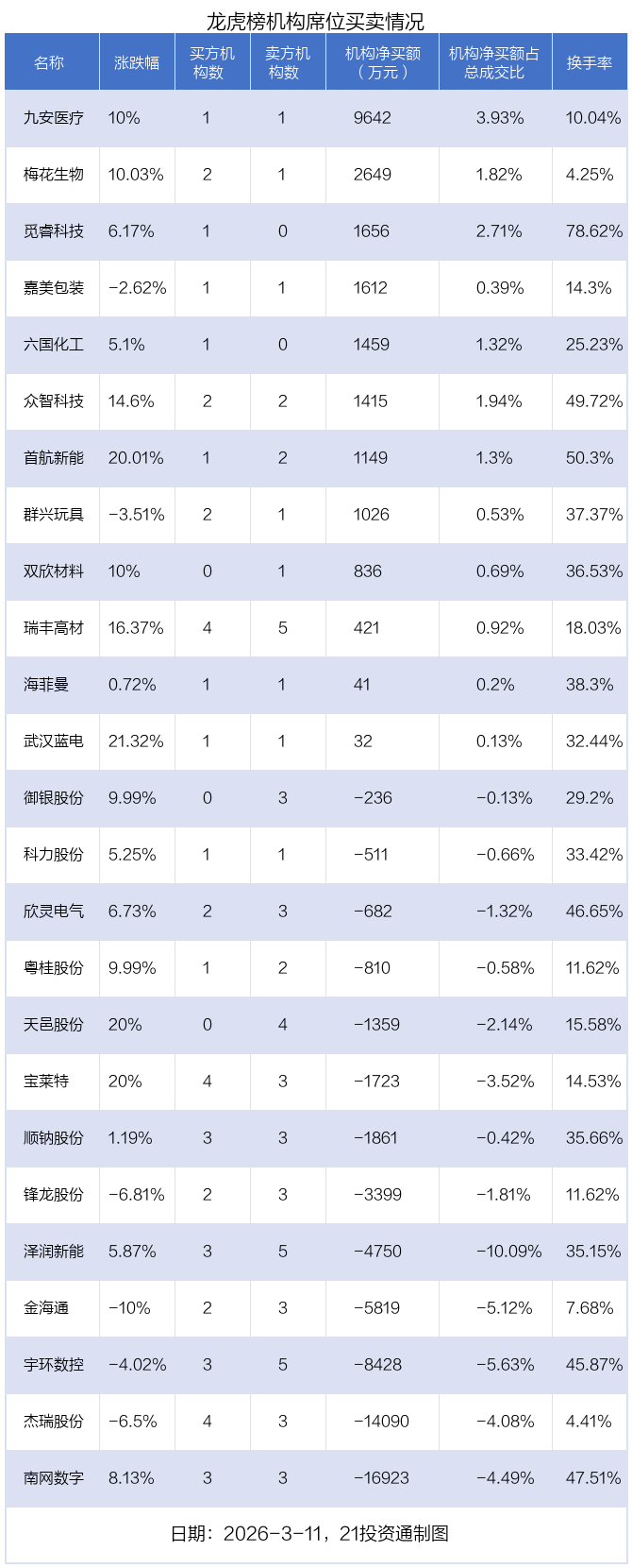 3月11日,25只个股龙虎榜出现了机构的身影,机构合计净卖出3.87亿元。具体来看,机构净买入12股,净卖出13股。