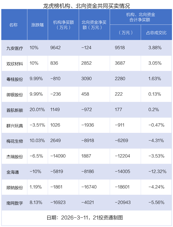 值得注意的是,机构和北向资金共同净买入了双欣材料;共同净卖出了南网数字、金海通、顺钠股份等3股;在粤桂股份、杰瑞股份、御银股份、九安医疗、首航新能、群兴玩具、梅花生物上出现分歧,机构净卖出粤桂股份809.91万元,北向资金净买入3090.37万元;机构净卖出杰瑞股份1.41亿元,北向资金净买入1886.81万元;机构净卖出御银股份235.99万元,北向资金净买入458.17万元;机构净买入九安医疗9641.53万元,北向资金净卖出123.89万元;机构净买入首航新能1148.83万元,北向资金净卖出972.07万元;机构净买入群兴玩具1025.51万元,北向资金净卖出1936.02万元;机构净买入梅花生物2649.22万元,北向资金净卖出8918.01万元。
