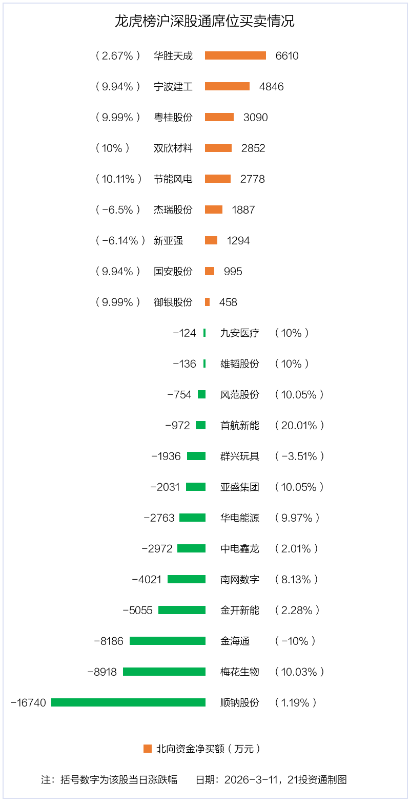 3月11日,北向资金参与龙虎榜中的个股共有22只,合计净卖出2.98亿元。其中沪股通净买入4股,净卖出6股,合计净卖出1.22亿元;深股通净买入5股,净卖出7股,合计净卖出1.76亿元。