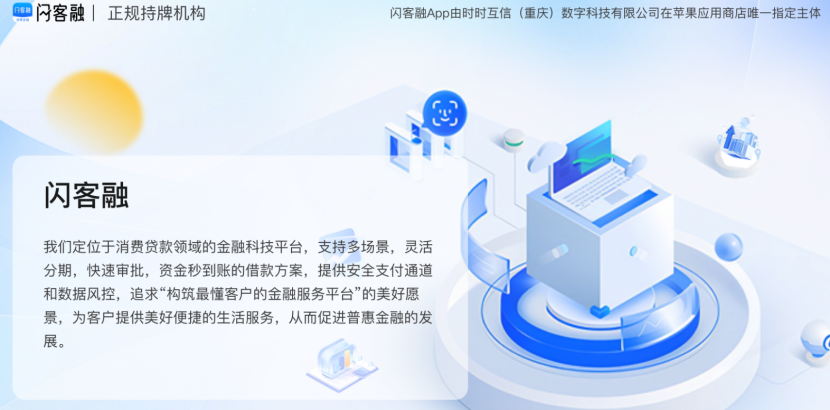 企惠小贷最新合作的为时小融,运营主体为时时互信(重庆)数字科技有限公司(以下简称“时时互信重庆”),目前正以闪客融的名称展业,宣传为正规持牌机构,是以企惠小贷的主体上线官网。