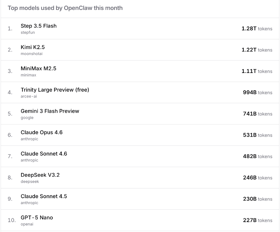 OpenRouter数据显示,OpenClaw的日榜与月榜前三甲被中国大模型Step 3.5 Flash、Kimi K2.5、MiniMax M2.5包揽。
