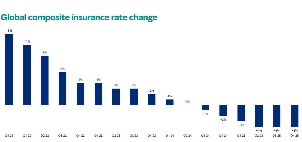 国际保险经纪巨头达信(Marsh)近日发布的最新一期全球保险市场费率报告数据显示,2025年第四季度,全球商业保险费率再次下跌了4%。在历经七年上涨后,这一指标已连续第六个季度走低。