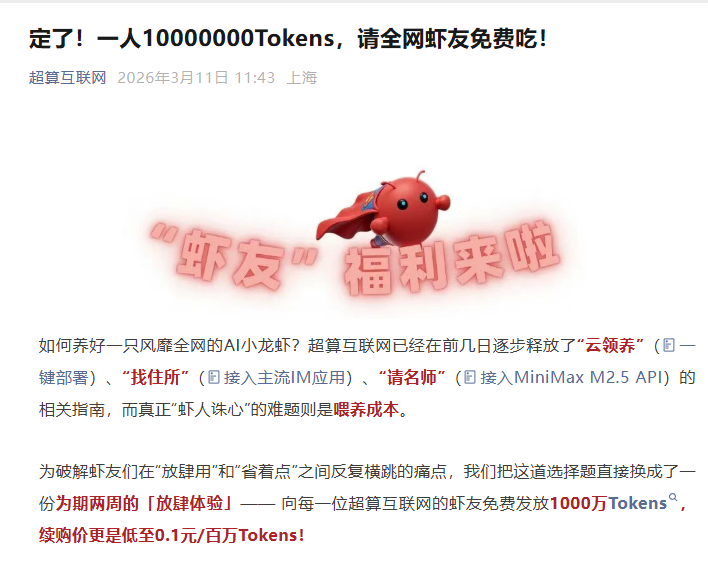 超算互联网:向每位OpenClaw用户免费发放1000万Tokens