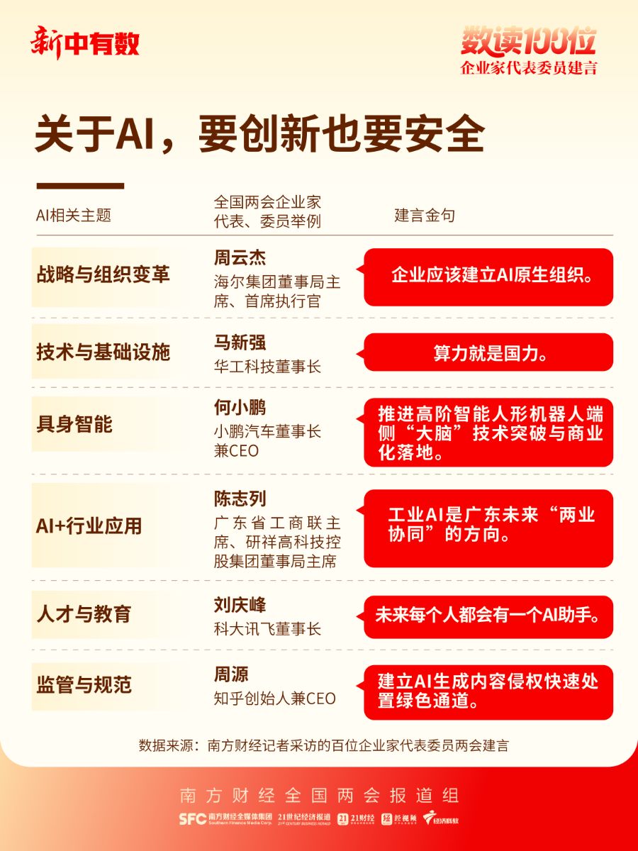 对于各个特定议题,企业家代表委员们结合自身领域建言献策。关于AI,企业家们不仅关注技术本身,还强调基础设施与监管规范。关于新质生产力,有人关注先进技术的工程化落地,有人主张通过创新手段破除“内卷”。