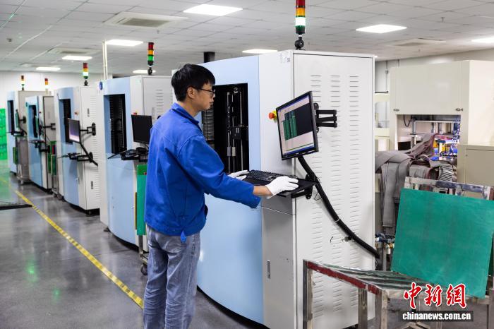 图为恒源电子(贺州)有限公司生产车间内,工人正在操作自动化设备测试线路板。蒙继超摄