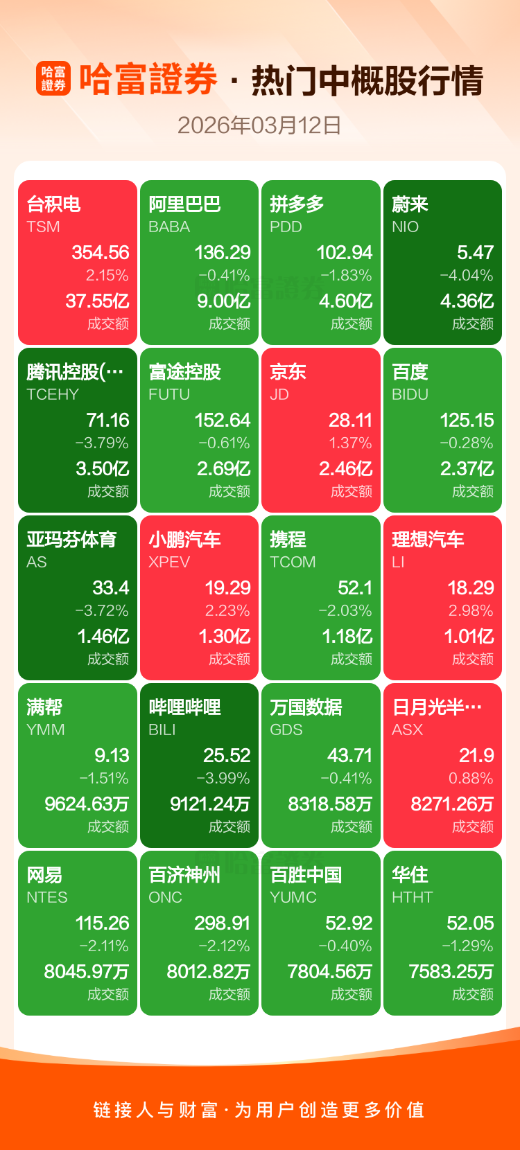 台积电涨2.15%,阿里巴巴跌0.41%,拼多多跌1.83%,蔚来跌4.04%,腾讯控股(ADR)跌3.79%,富途控股跌0.61%,京东涨1.37%,百度跌0.28%,亚玛芬体育跌3.72%,小鹏汽车涨2.23%。
