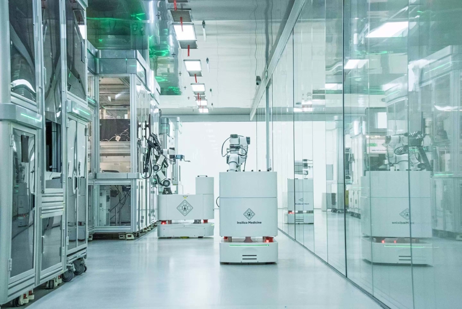 去年9月,英矽智能自动化实验室在浦东启动运营。这个无人实验室由细胞培养、基因测序、高通量筛选等6个功能岛组成,岛与岛之间通过装有机械臂的自动导向车连接。各个功能岛上,灌装试剂、取化合物、样本处理等所有实验步骤都由“机器人+科学仪器”完成,可7×24小时不间断运营,工作量相当于一个50人左右的生物学实验团队。
