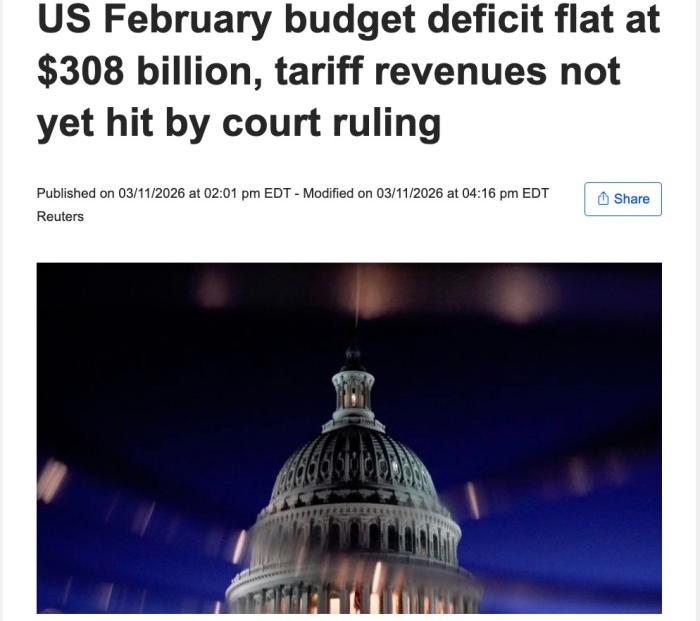 美国政府2月预算赤字为3080亿美元