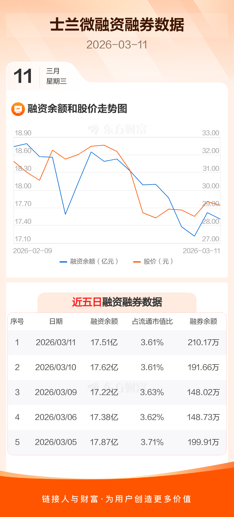 交易所最新数据显示,士兰微于2026年3月11日获融资买入8076.79万元,融资偿还9207.43万元,当日融资净偿还1130.64万元。目前,该股融资余额17.51亿,占流通市值比例为3.61%。