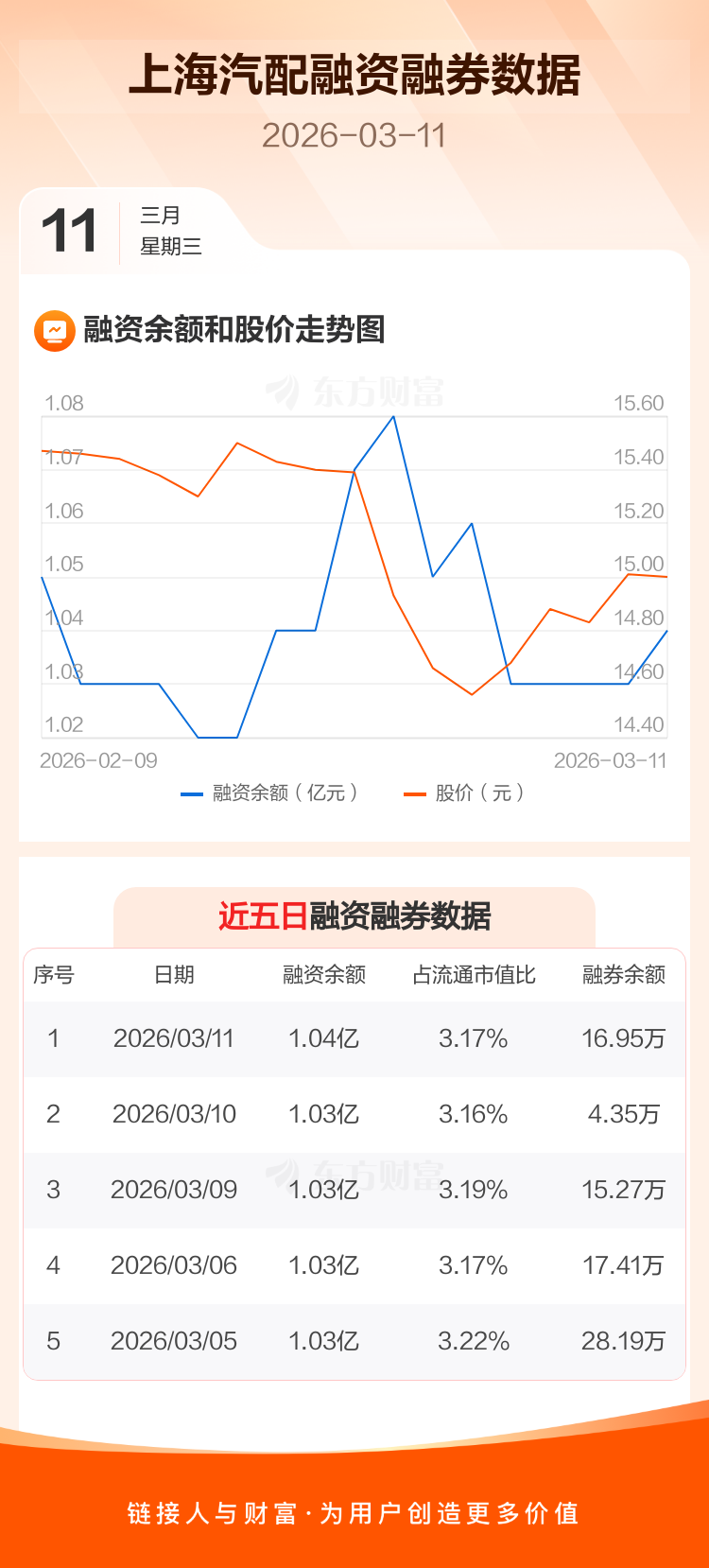 交易所最新数据显示,上海汽配于2026年3月11日获融资买入221.86万元,融资偿还180.92万元,当日融资净买入40.95万元。目前,该股融资余额1.04亿,占流通市值比例为3.17%。