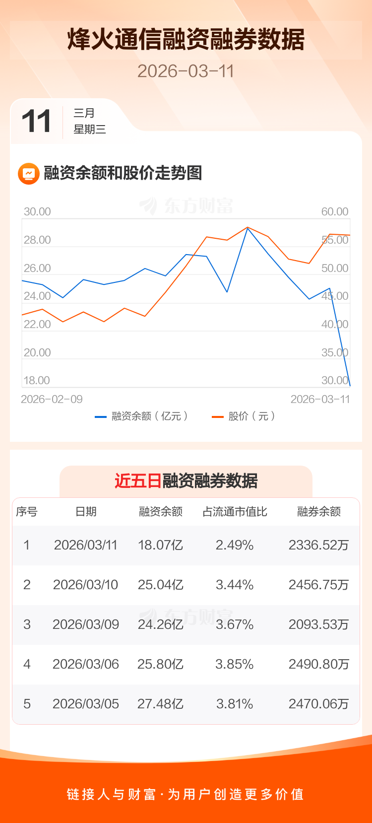 交易所最新数据显示,烽火通信于2026年3月11日获融资买入8.12亿元,融资偿还15.09亿元,当日融资净偿还6.97亿元。目前,该股融资余额18.07亿,占流通市值比例为2.49%。