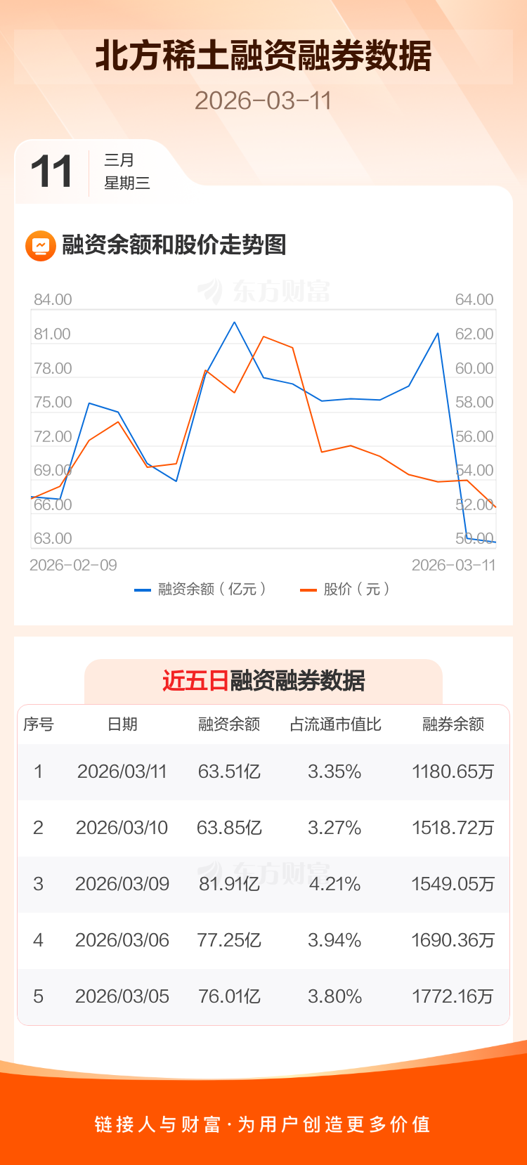 交易所最新数据显示,北方稀土于2026年3月11日获融资买入3.95亿元,融资偿还4.29亿元,当日融资净偿还3385.8万元。目前,该股融资余额63.51亿,占流通市值比例为3.35%。