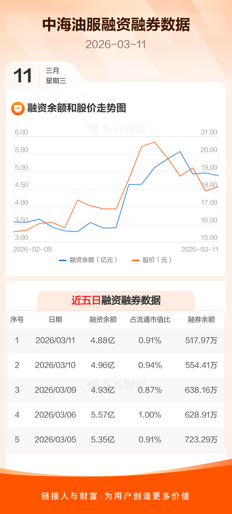 交易所最新数据显示,中海油服于2026年3月11日获融资买入1.03亿元,融资偿还1.10亿元,当日融资净偿还759.47万元。目前,该股融资余额4.88亿,占流通市值比例为0.91%。