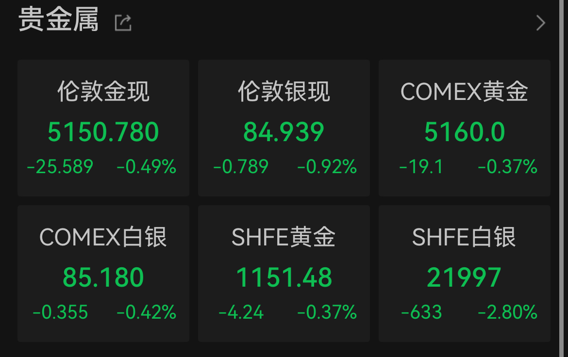 黄金、白银继续走弱。截至发稿,伦敦金现跌0.49%、伦敦银现跌0.92%;COMEX黄金、COMEX白银均下跌。