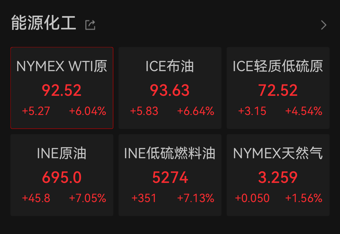 【大河财立方消息】北京时间3月12日早间,国际油价持续大涨。截至发稿,WTI原油报92.52美元/桶,ICE布油报93.63美元/桶,涨幅均超6%。