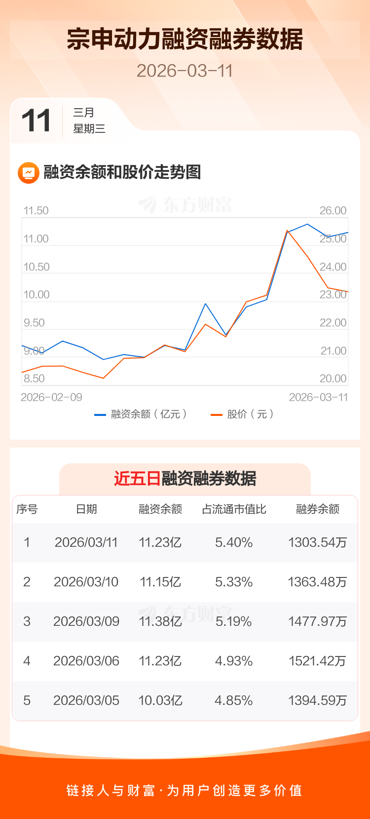 交易所最新数据显示,宗申动力于2026年3月11日获融资买入2.29亿元,融资偿还2.21亿元,当日融资净买入832.8万元。目前,该股融资余额11.23亿,占流通市值比例为5.40%。