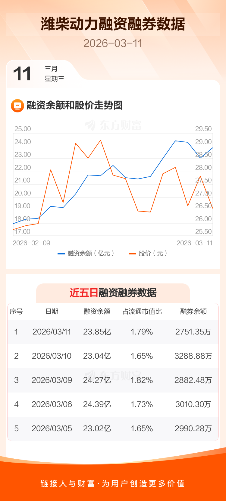 交易所最新数据显示,潍柴动力于2026年3月11日获融资买入3.55亿元,融资偿还2.73亿元,当日融资净买入8165.04万元。目前,该股融资余额23.85亿,占流通市值比例为1.79%。