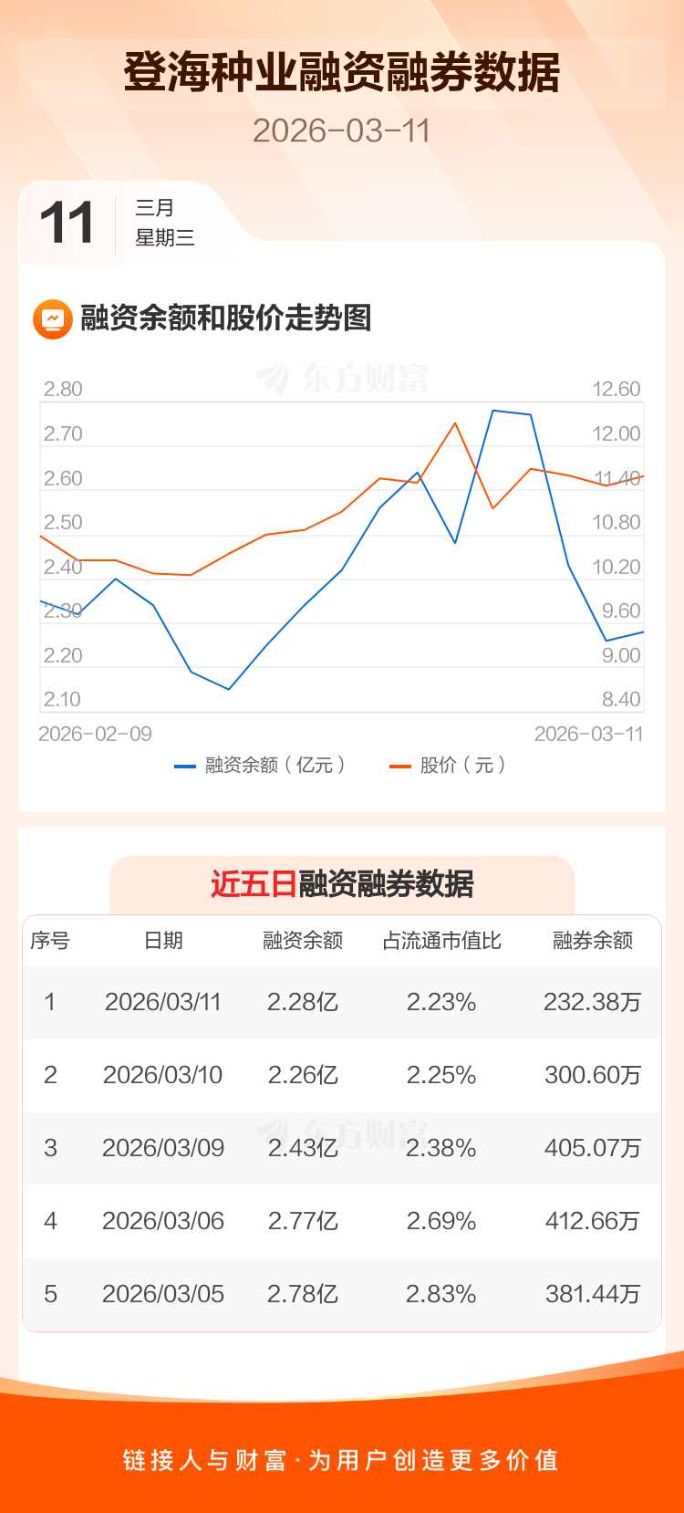 交易所最新数据显示,登海种业于2026年3月11日获融资买入5164.24万元,融资偿还5041.50万元,当日融资净买入122.74万元。目前,该股融资余额2.28亿,占流通市值比例为2.23%。