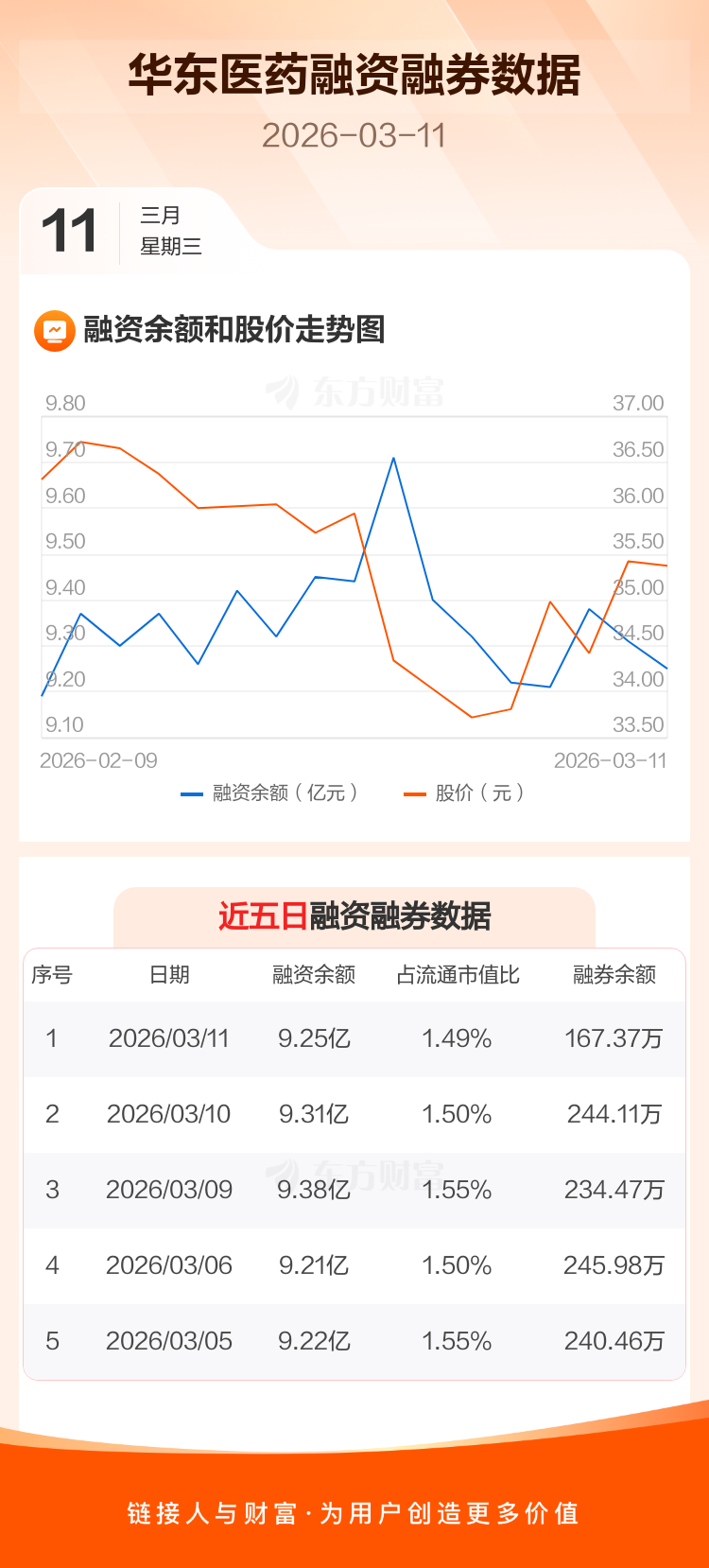 交易所最新数据显示,华东医药于2026年3月11日获融资买入1861.47万元,融资偿还2441.17万元,当日融资净偿还579.7万元。目前,该股融资余额9.25亿,占流通市值比例为1.49%。
