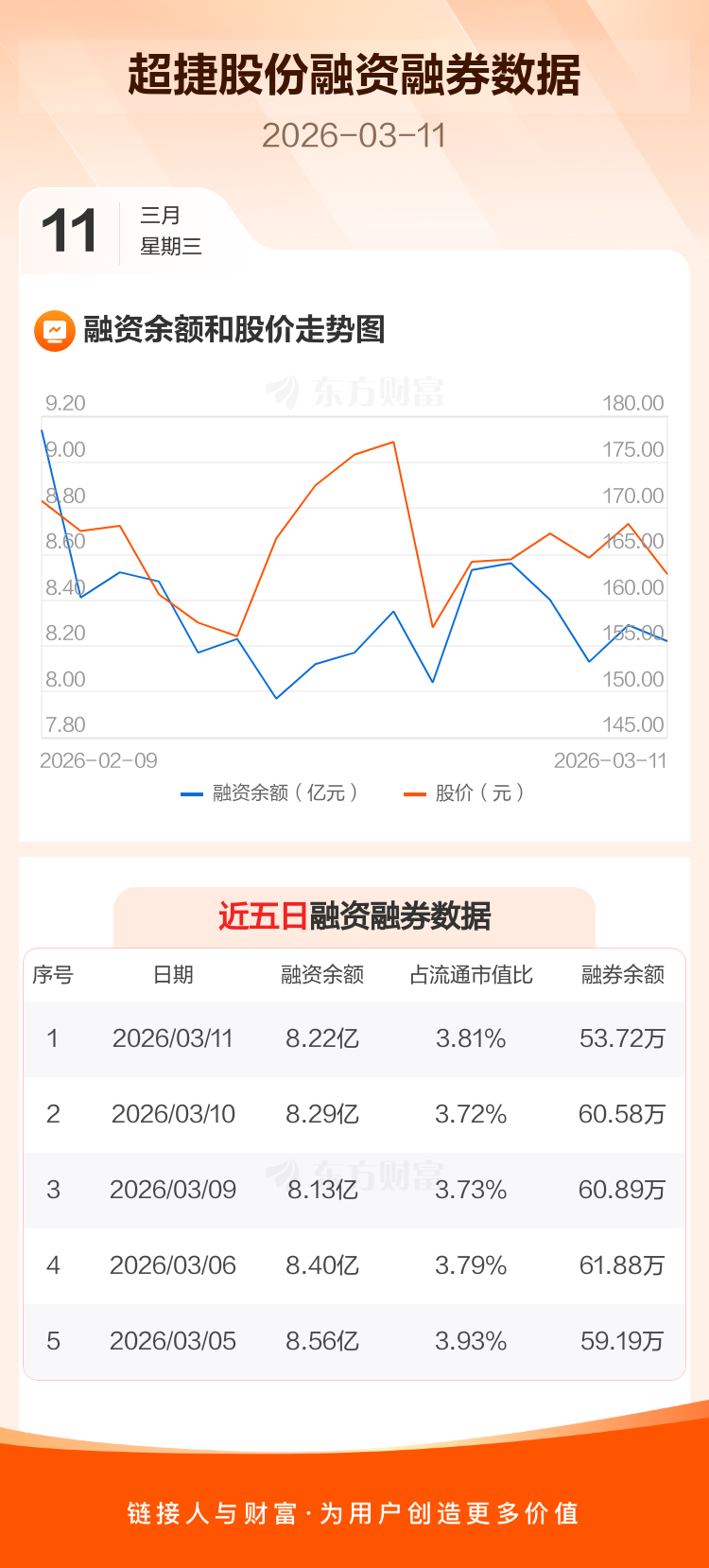 交易所最新数据显示,超捷股份于2026年3月11日获融资买入1.26亿元,融资偿还1.33亿元,当日融资净偿还690.19万元。目前,该股融资余额8.22亿,占流通市值比例为3.81%。