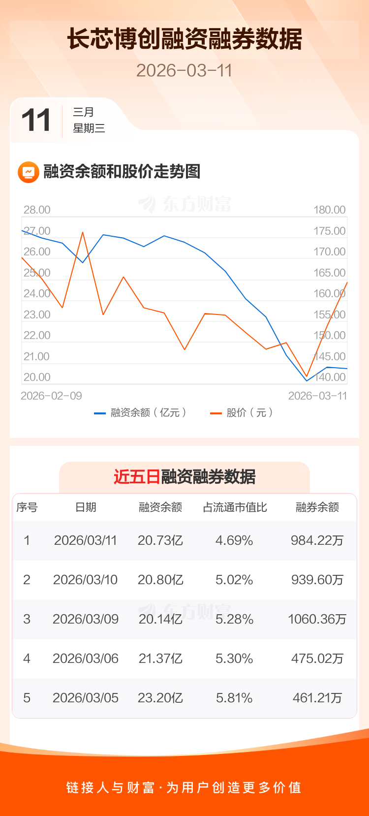 交易所最新数据显示,长芯博创于2026年3月11日获融资买入6.39亿元,融资偿还6.46亿元,当日融资净偿还711.91万元。目前,该股融资余额20.73亿,占流通市值比例为4.69%。