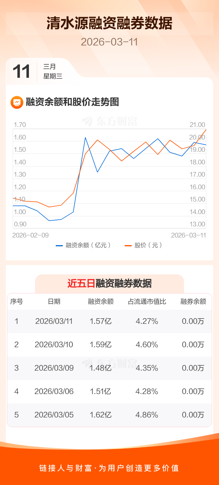 交易所最新数据显示,清水源于2026年3月11日获融资买入7172.64万元,融资偿还7384.46万元,当日融资净偿还211.82万元。目前,该股融资余额1.57亿,占流通市值比例为4.27%。
