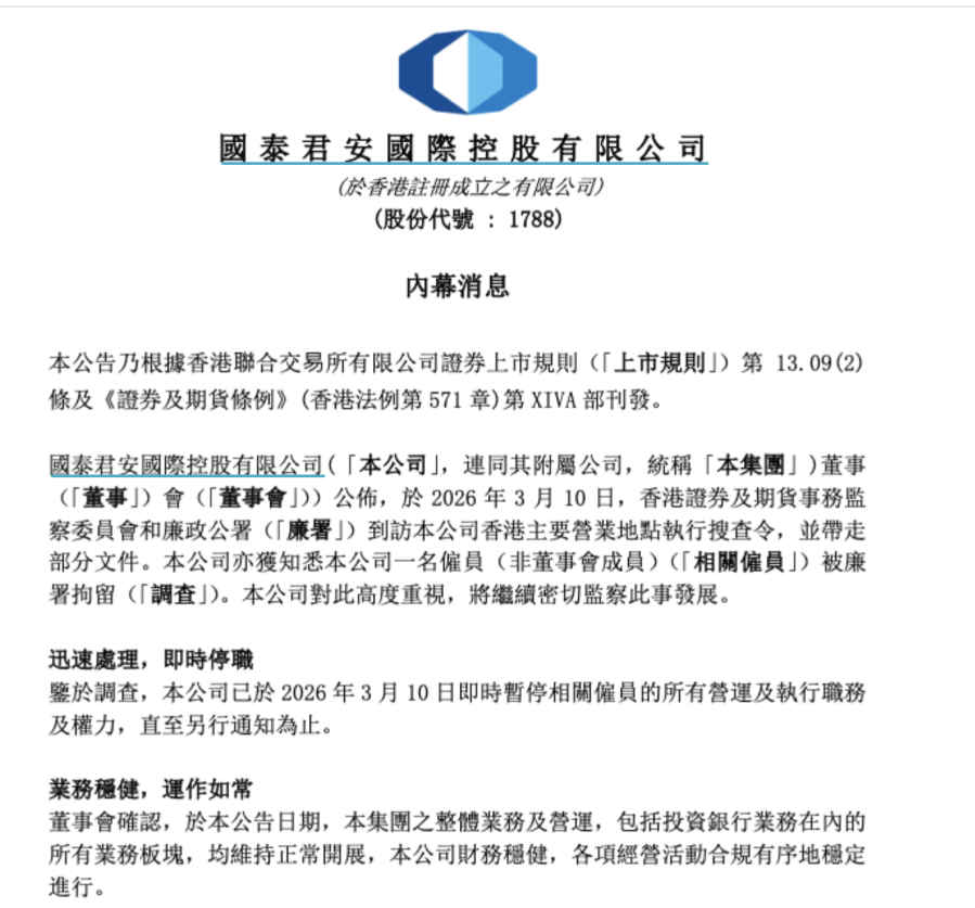3月12日盘前,国泰君安国际发布公告证实,3月10日,香港证监会和廉政公署到访公司香港主要营业地点执行搜查令,一名雇员(非董事会成员)被廉政公署拘留。公司已即时暂停相关雇员的所有运营、执行职务及权力。