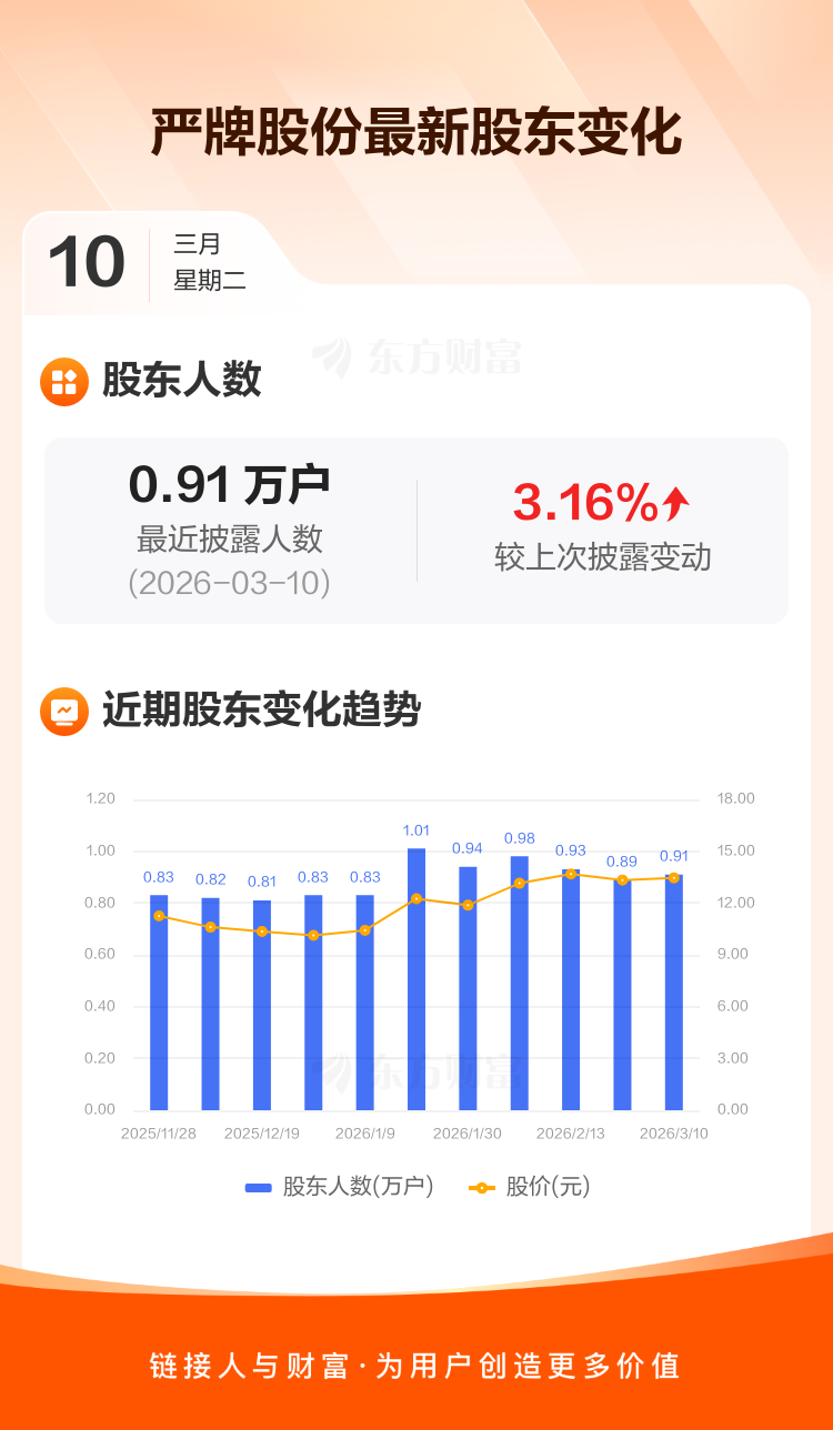 严牌股份最新披露数据显示,截至3月10日公司股东户数为9136户,较上期(2026年2月27日)增加280户,增幅为3.16%。户均持有流通股数量由上期的2.46万股下降至2.39万股,户均持股金额由上期的32.81万元减少至32.09万元。