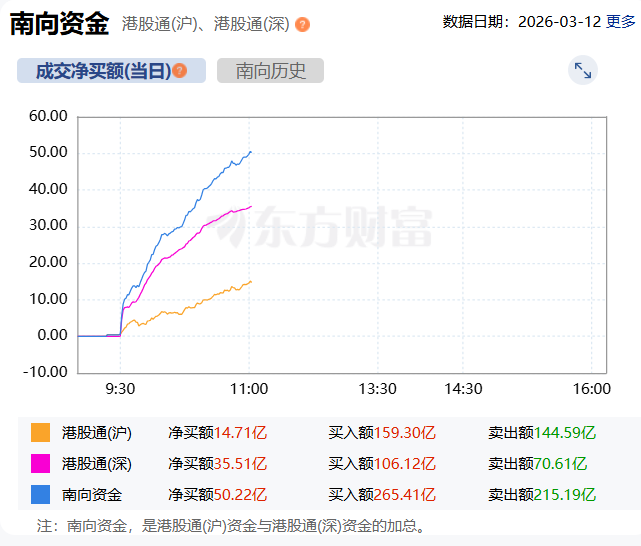截至目前,南向资金净买入超50亿港元。