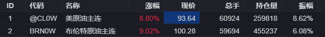 消息面上,国际原油期货盘中短线拉升,布伦特原油价格涨幅一度扩大至10%,现涨超9%,重回100美元上方,WTI原油期货涨幅一度扩大至9%,现涨8.80%。