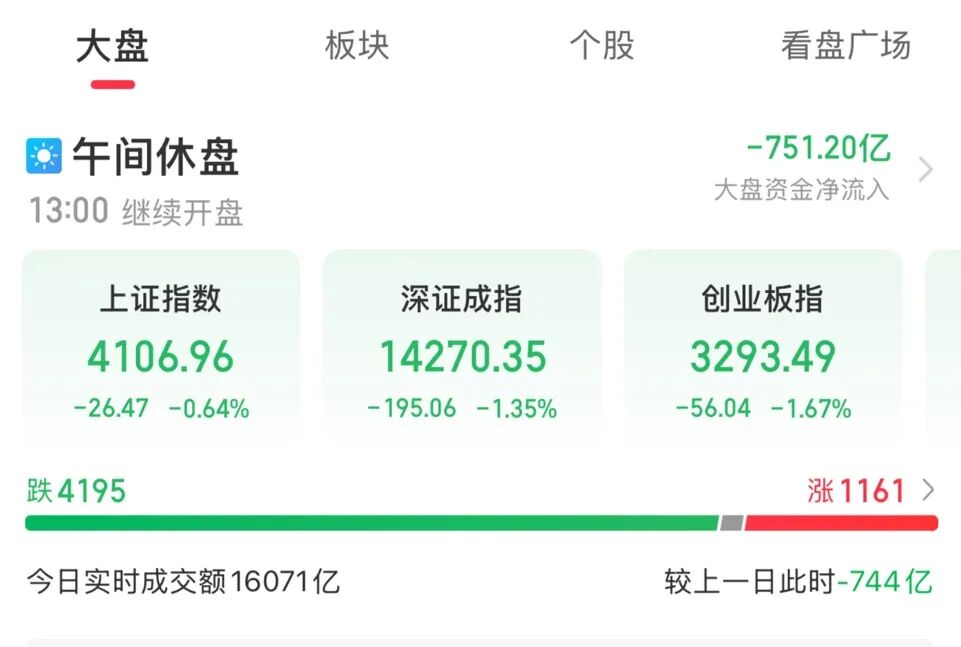 A股主要指数早盘集体下跌,截至午间收盘,沪指跌0.64%,深证成指跌1.35%,创业板指跌1.67%,科创综指跌1.68%。沪深北三市半日成交16071亿元,较上个交易日同期缩量744亿元。