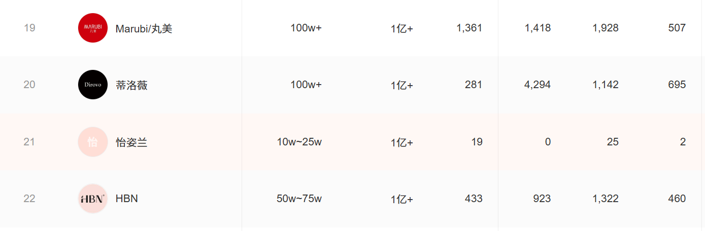 只不过虽然跻身“亿元俱乐部”,但榜单上怡姿兰的其他数据却显得格格不入。以榜单18-22名为例,其他品牌的商品数均在200以上,而怡姿兰仅为19;关联直播数这一项,其他品牌均在1000以上,而怡姿兰仅为25。