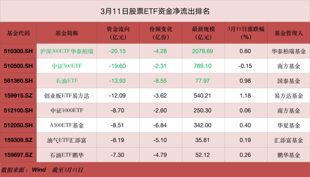 3月11日,部分核心宽基ETF呈现资金净流出态势。其中,沪深300ETF单日净流出达34.3亿元,中证A500ETF和中证500ETF单日净流出均超25亿元。